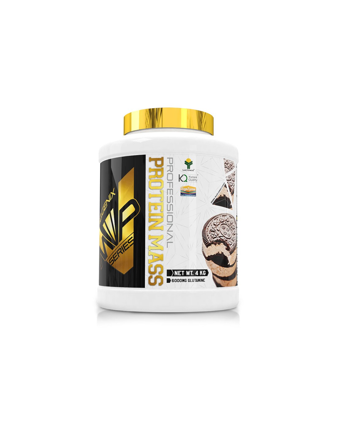 Preparado en polvo a base de hidratos de carbono y proteínas, con azúcar y edulcorante, enriquecido con vitamina B6. Sabor galleta negra. Peso neto: 4 kg. Consejo de utilización: Tomar 50 g (1 cazo de 90 ml aprox.) con 400 ml de agua o leche desnatada, dos veces al día. Ingredientes: Harina de avena (gluten), maltodextrina, potenciador del sabor (E-640), concentrado de proteína de suero de leche (leche) LACPRODAN® (emulgente (lecitina de soja)), proteina de leche, L-glutamina KYOWA QUALITY®, creatina monohidrato 200 mesh, cacao en polvo (Theobroma cacao L), galleta de cacao molida (Harina de trigo (gluten), azúcar, grasa de palma, aceite de nabina, cacao magro en polvo 4,3 %, almidón de trigo (gluten), jarabe de glucosa y fructosa, gasificantes (carbonatos de potasio, carbonatos de amonio y carbonatos de sodio), sal, emulgentes (lecitina de soja), corrector de acidez (hidróxido sódico), aroma), aromas, edulcorante (sucralosa), enzimas digestivas DIGEZYME® (complejo multienzimático a base de amilasa, proteasa, lactasa, lipasa y celulasa) y vitamina B6 (clorhidrato de piridoxina). Puede contener trazas de frutos de cáscara, cacahuete, huevos, apio, sulfitos, mostaza y pescado. No recomendado para niños ni mujeres embarazadas. Conservar bien cerrado en un lugar fresco y seco. Lote / Consumir preferentemente antes del fin de: ver envase.