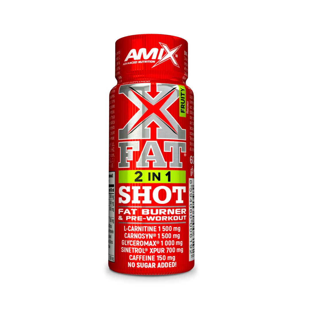 Amix™ XFat® 2in1 SHOT es un complemento alimenticio en formato líquido diseñado como una combinación de pre-entrenamiento. Este producto está formulado con ingredientes como L-carnitina, beta-alanina CarnoSyn®, GlyceroMax®, SINETROL® XPUR y cafeína.