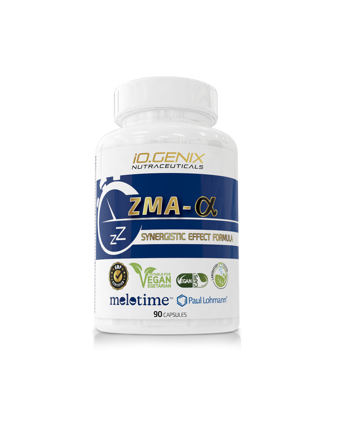 ZMA Alpha es un complemento alimenticio formulado con una combinación de minerales esenciales, aminoácidos y vitaminas en formas de alta biodisponibilidad, cuidadosamente seleccionadas. Su fórmula incluye magnesio en formas queladas, bisglicinato de zinc, L-triptófano y melatonina de liberación prolongada (Melotime™).